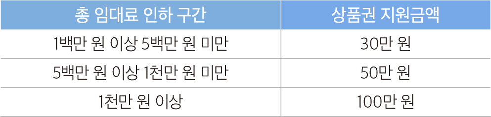 • 상반기 상품권 지급받은 임대인이 추가로 임대료를 인하할 경우 기존 임대료 인하액에 금번 임대료 인하액을 합산한 금액으로 구간별 금액 적용