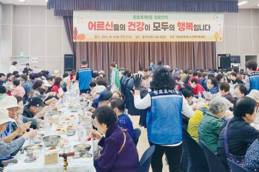 경로의달을 맞이하여 원효로1동 노인복지후원회(회장 김희겸)에서 주관한 경로잔치가 10월 8일 주민센터 4층 대강당에서 개최되었다. 이번 행사에서는 관내 만 77세 이상 어르신 350명 을 대상으로 삼계탕을 대접하고 노인복지후원회와 관내 업체 오리온, 원효새마을금고, 참좋은치과의원, 좋은습관마취통증의학과의원의 협찬으로 마련한 선물을 증정했다. 김희겸 노인복지후원회장은 “경로의달을 맞이하여 준비한 이 잔치를 통해 어르신들에게 공경과 감사의 마음이 잘 전달되었으면 좋겠다”라고 말했다.