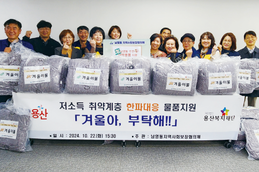 남영동 지역사회보장협의체(위원장 김미라)는 지난 10월 22일 혹한기를 대비하여 주거 환경이 열악한 저소득 청장년 21가구에 겨울 이불을 전달했다. 김미라 위원장은 “우리 이웃들이 조금이나마 추위 걱정 없이 겨울을 보내는 데 도움이 됐으면 좋겠다”라고 말했다. 한편 협의체는 올해 주거환경 개선, 생활용품 및 식료품 지원, 이미용 서비스 등 다양한 나눔 실천을 통해 복지 사각지대를 해소하는 데 기여했다.