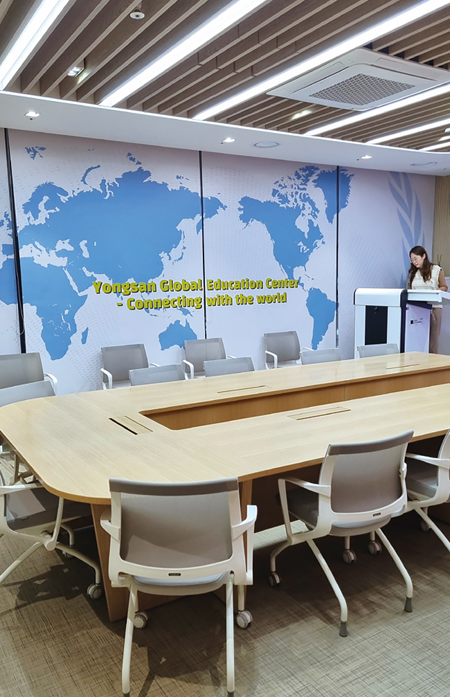 용산글로벌교육지원센터는 약 100여 평의 규모로 프로그램 1~3실, 라운지, 다목적실, 상담실, 모의 UN실 등으로 이루어져 있다. 센터는 ‘학생 중심, 체험 중심 교육’을 핵심 가치로 삼고 ▲진학 상담 ▲자기 주도 학습 ▲인성 및 주도력(리더십) 교육 ▲인공지능(AI) 기반 학습 등을 선보일 예정이다.