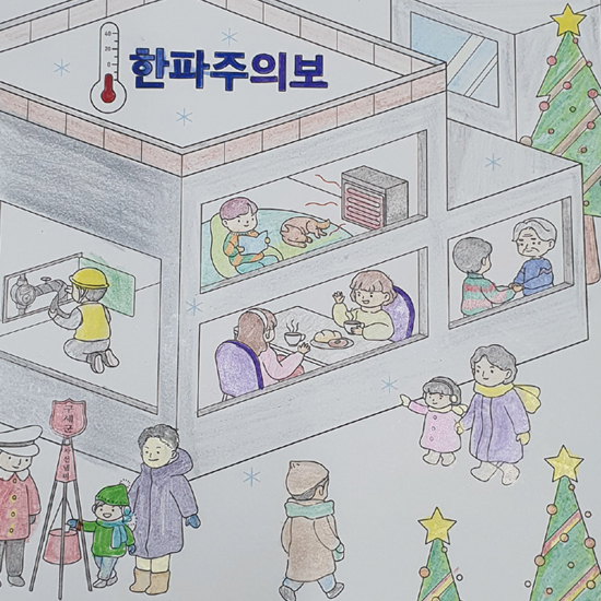 초등학교 2학년인 아이가 컬러링한 겨울 추위를 대비하는 구민들의 모습입니다.