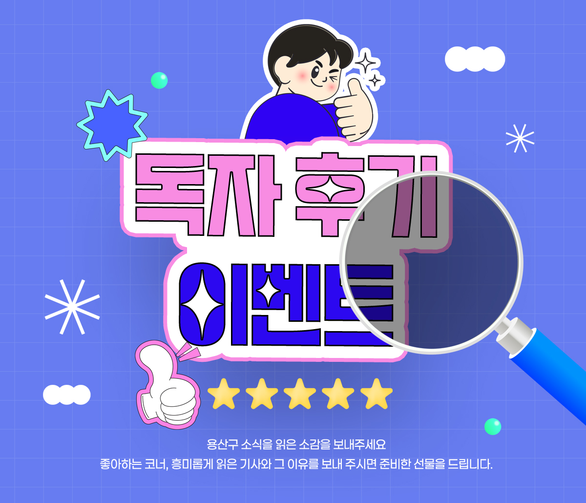 용산구민 모여라 이벤트 2 <용산구소식> 독자 후기 이벤트 새롭게 단장한 <용산구소식> 2월호를 보신 소감을 보내주세요. 기재 내용 성함, 연락처, 주소(용산구 ○○동까지 만), 2월호 소식지에 대한 전체평, 가장 좋아하는 코너와 그 이유 등을(2개 질문에 대한 답변) 기재 독자 선물 2만 원 모바일 상품권(5명) 신청 마감 2026. 2. 5.(목) 23:59까지 이벤트 종료 이전컨텐츠 다음컨텐츠