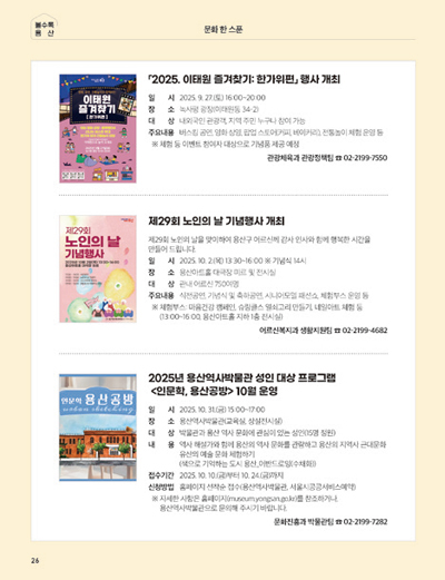 문화 한스푼 코너는 아이들을 데리고 근처에서 즐길 수 있는 역사 문화 예술 등의 정보가 매우 유익합니다. 또한 용산구에 살고 계신 부모님들과 함께 힘들게 멀리 가지 않아도 용산 안에서 즐길 수 있는 정보를 알게 되니 늘 유용하네요.