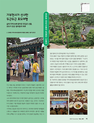 11월 소식지에서 특히 더 좋았던 건 청파동 어른들 모신 효도여행이었어요. 용산 토박이 어르신들을 모시고 이렇게 멋진 이벤트를 진행하시다니 참 따뜻합니다.