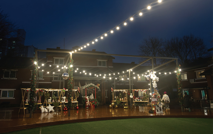 용산공원 장교숙소 5단지가 1월 31일까지 ‘해피크리스마스 빌리지’로 변신해 관람객을 맞이한다. 특히 매주 금요일과 토요일은 7시까지 야간 개장하여, 낭만적인 겨울밤을 만끽할 수 있는 기회가 늘었다. 입장 시 웰컴라운지를 거쳐 파빌리온, 잔디마당, 카페 언타이틀드, 아메리칸 라운지까지 이국적인 코스를 둘러볼 수 있다.