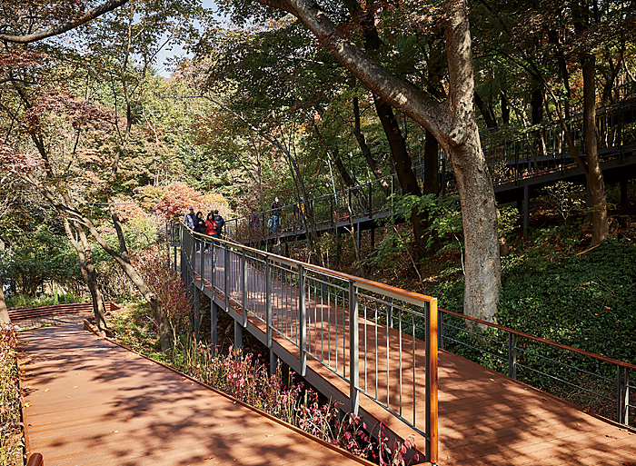 걷기 편한 데크길에서 도심 풍경을 조망하며 느긋하게 대화하기 좋은 코스