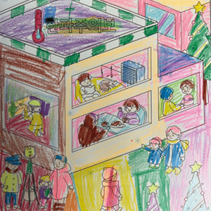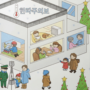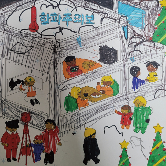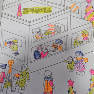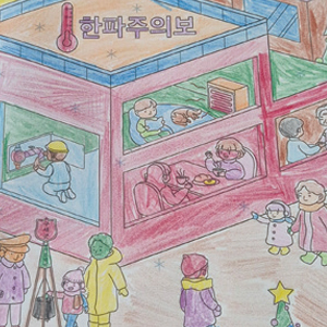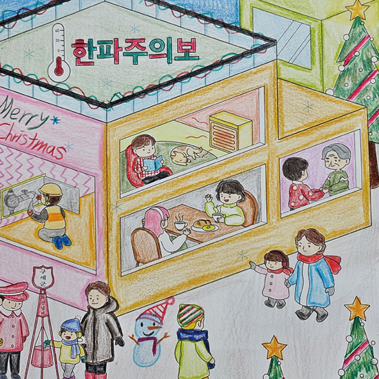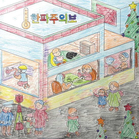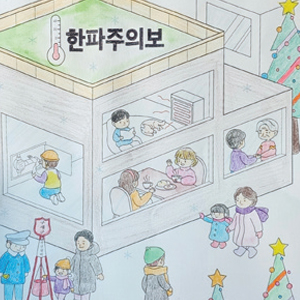 초등학교 2학년인 아이가 컬러링한 겨울 추위를 대비하는 구민들의 모습입니다.