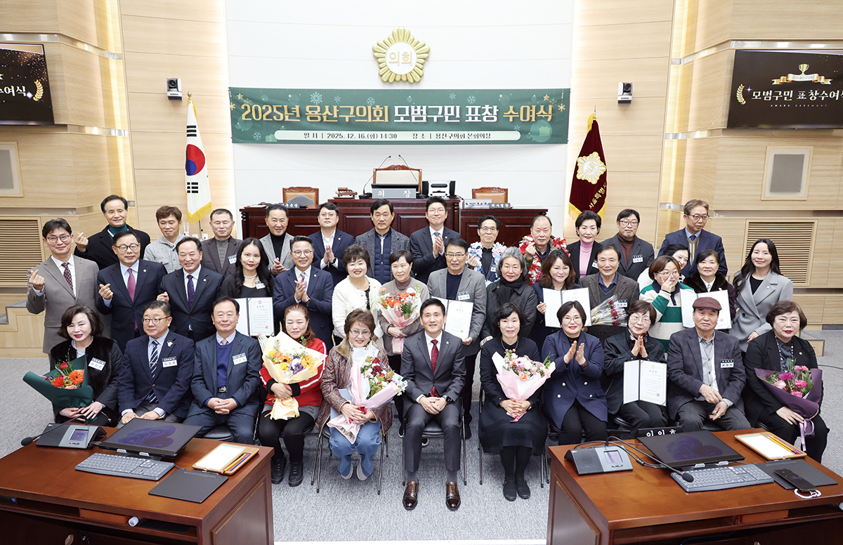 용산구의회는 지난 12월 16일 본회의장에서 지역사회 발전과 주민 화합에 기여한 구민을 선정해 ‘2025년도 용산구의회 모범구민 표창 수여식’을 개최했습니다.
