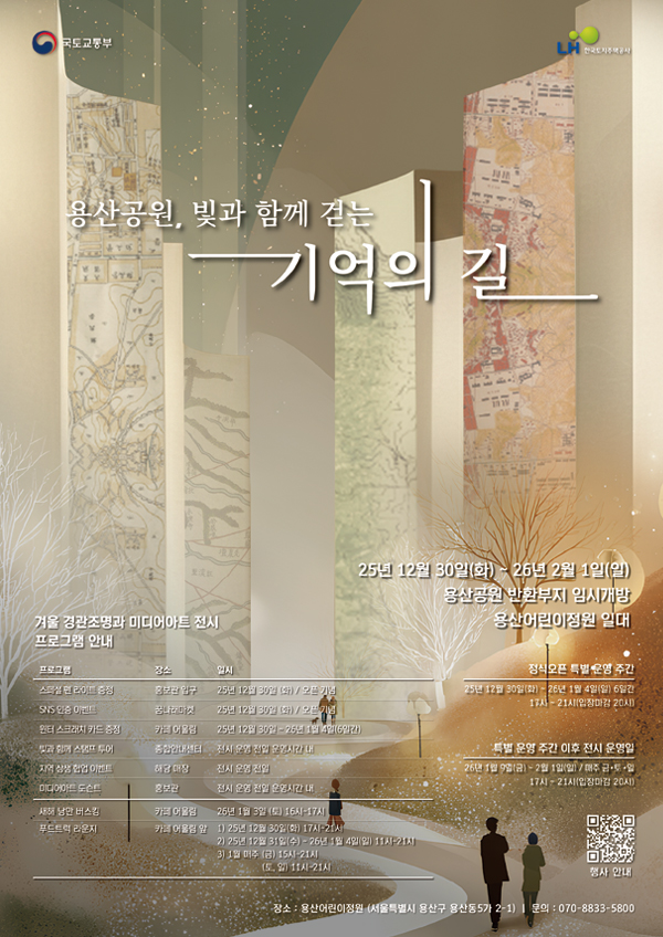 빛과 영상, 사운드가 어우러진 5개 구간을 따라 과거의 기억에서 미래의 희망까지. 용산공원 부지의 역사와 문화를 따라 걷는 나이트워크(Night Walk)형 미디어아트 전시