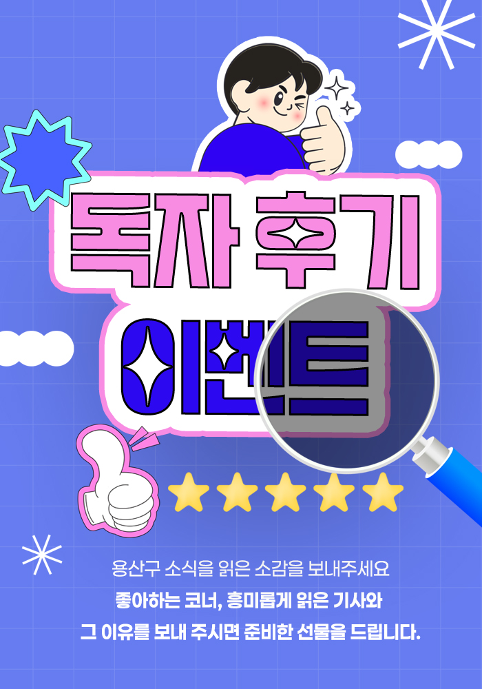 용산구민 모여라 이벤트 2 <용산구소식> 독자 후기 이벤트 새롭게 단장한 <용산구소식> 2월호를 보신 소감을 보내주세요. 기재 내용 성함, 연락처, 주소(용산구 ○○동까지 만), 2월호 소식지에 대한 전체평, 가장 좋아하는 코너와 그 이유 등을(2개 질문에 대한 답변) 기재 독자 선물 2만 원 모바일 상품권(5명) 신청 마감 2026. 2. 5.(목) 23:59까지 이벤트 종료 이전컨텐츠 다음컨텐츠