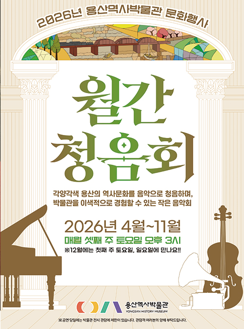 용산의 역사문화를 음악으로 감상하며, 박물관을 이색적으로 경험할 수 있는 작은 음악회가 2026년에도 계속 됩니다. 전시도 보고, 음악도 듣고. 다채로운 용산의 이야기를 담은 청음회에 여러분을 초대합니다.